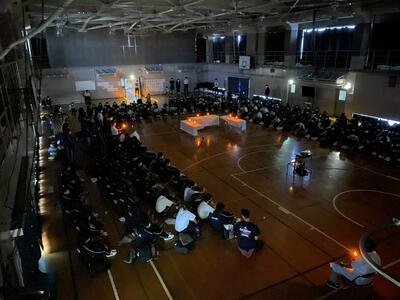 体育館でキャンドルファイヤーが行われています。厳かな雰囲気の中、一人一人が決意表明を精一杯表現しています。
