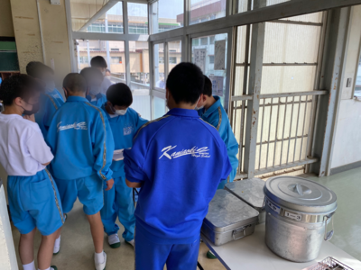 給食準備のやり方を、3年生が1年生に教え見守る光景がありました。上青木中の給食準備について分からない1年生に、丁寧に優しく教えている様子でした。