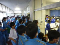 ↑ 吹奏楽部のミニコンサートに集まる1年生