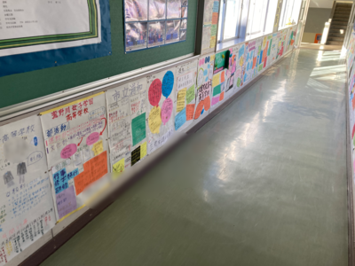渡り廊下には、各クラス・各班がしっかりと調べた学校の数々が掲示されています。